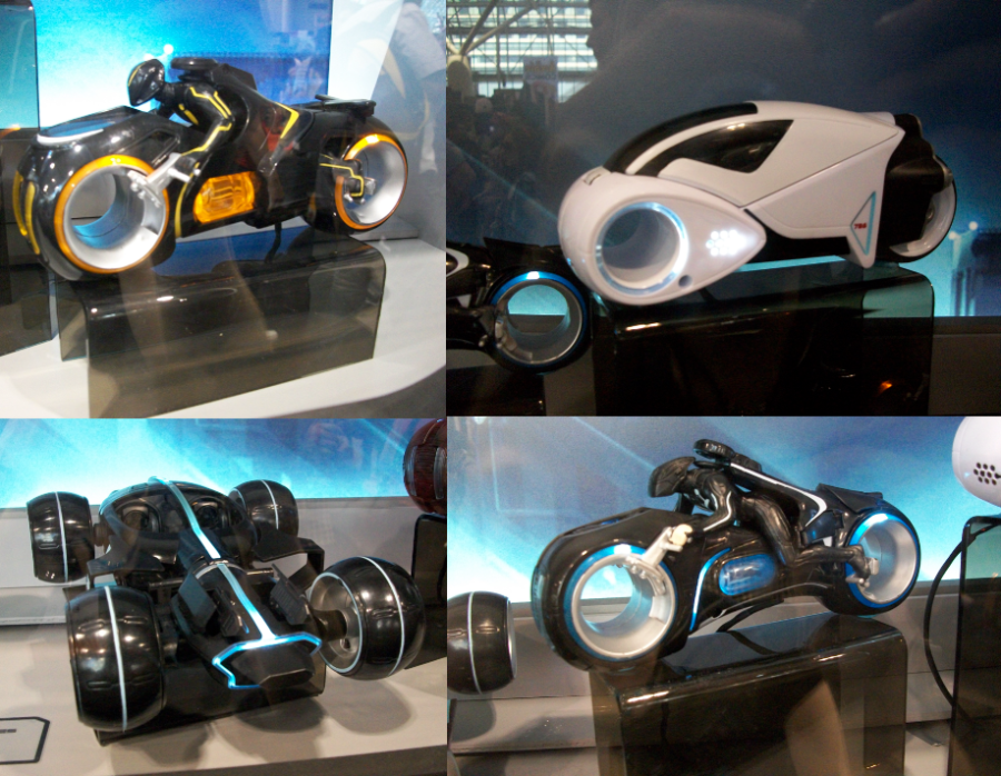 The TRON booth couldn’t be missed in the centre of the exhibition hall, with its tall mockup of a gantry-like “Recognizer.” Copies of the game were set up for people to play, and life-size figures and samples of merchandise were on display. Several Quorra lookalikes were on hand to answer questions and toss out “FLYNN LIVES” T-shirts and disks to a few lucky fans.  Overall it was a well-designed promotion for the upcoming film and related material.
