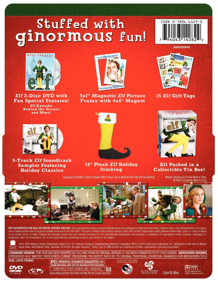 The 2-disc DVD, a 5” x 7” magnetic Elf picture frame with a 4” x 6” magnet, 15 Elf gift tags, a 5-track Elf soundtrack sampler featuring holiday classics, and 14” plush Elf holiday stocking. (Click here for back view)