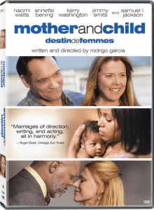 Mother and Child follows three women, particularly in their roles as mothers and daughters. Karen (Annette Bening) wonders about the daughter she had 37 years prior at fourteen and never met, as she cares for her own mother in her final days. Karen is extremely wary and intolerant of anyone who doesn’t meet her standards, until softened by the kind attention of her new coworker Paco (Jimmy Smits). Elizabeth (Naomi Watts), who we realize implicitely is Karen’s daughter, is a brilliant lawyer who will stop at nothing to get ahead with her new boss Paul (Samuel L. Jackson). Lucy (Kerry Washington) is negotiating the adoption of a baby.