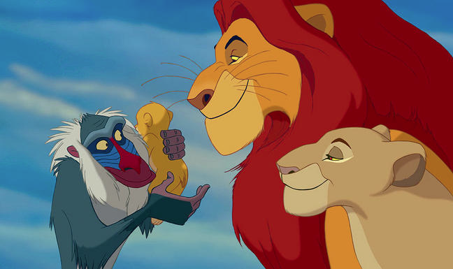 Rafiki (Robert Guillaume) holds up baby Simba (Jonathan Taylor Thomas) to his mother and father Mufasa (James Earl Jones) in Disney’s classic The Lion King.