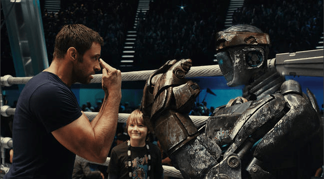 The year is 2016 and human boxers have been replaced by the new tough sport of robot boxing for the past few years.  Charlie Kenton (Hugh Jackman) is a former boxer, now trying to make ends meet by buying used fighter-bots and getting them underground fights for cash.  When his estranged son Max (Dakota Goyo) ends up under his care for the summer, for the first time, Charlie has to be a father.  At first he figures Max will just get in the way, but then when the boy discovers an old sparring bot at the junk yard and begins to fix him up, it seems that both of their luck is about to change.  The new bot’s name is Atom – a G2 bot from a few years back – and a true underdog in the world of robot boxing.   But when Max insists they find him a fight, they end up a bigger sensation than they could have imagined, leading to a shot at the Real Steel championships.