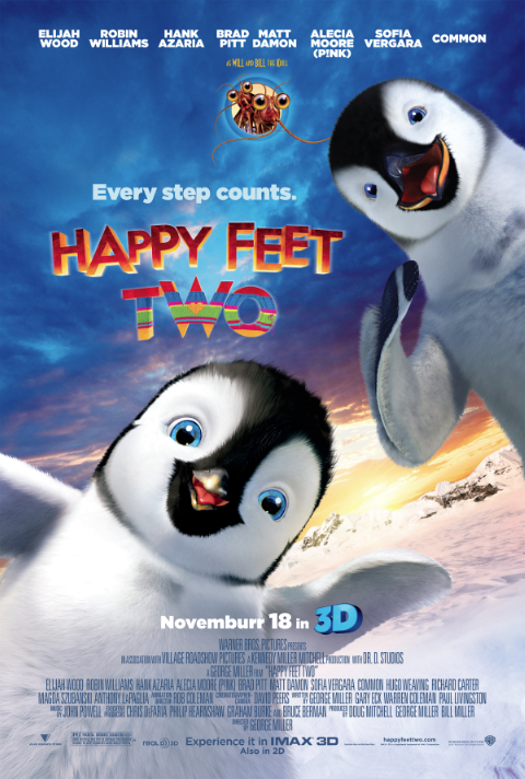 Happy Feet Two is the sequel to the best animated Oscar winner of 2006. Despite having inexplicably kept his chick face, the dancing emperor penguin Mumble (Elijah Wood) is all grown up with his own chick Erik (Ava Acres). When falling glaciers and predatory skua threaten the emperor colony, the Adélie colony including Ramon and rockhopper Lovelace (both Robin Williams) help them out, along with a wayward “flying penguin” (actually a puffin) with a vaguely Scandinavian accent called Sven (Hank Azaria), the elephant seals and a Russian ship crew. On a much smaller scale, a pair of existential krill (Brad Pitt and Matt Damon) wander in and out of the scene.
