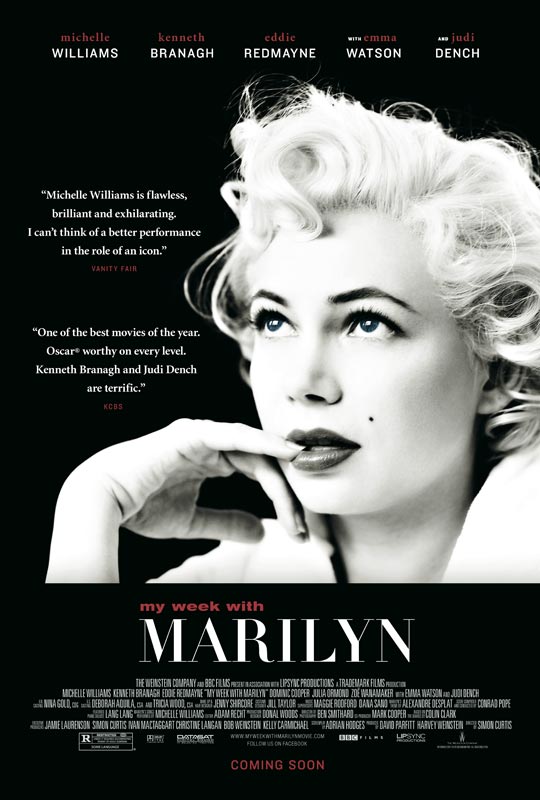 My Week With Marilyn, based on the memoirs of Colin Clark (Eddie Redmayne), covers the time spent in 1956 by 30-year-old Marilyn Monroe (Michelle Williams) on The Prince and the Showgirl, her only film outside the U.S. Striking out on his own at 23 in the film industry, the well-born Colin signed on as third assistant director. Though he fancied Lucy (Emma Watson) in wardrobe, the seductive but vulnerable Marilyn soon took Colin into her confidence as a personal support while her husband Arthur Miller (Dougray Scott) was back home in America. Though Marilyn got warm support from fellow cast member Sybil Thorndyke (Judi Dench), the film’s director and co-star Laurence Olivier (Kenneth Branagh) was annoyed by Monroe’s lack of discipline and dependence on her Actors Studio coach Paula Strasberg (Zoë Wanamaker), but he ultimately had to admire her brilliance up on the screen.