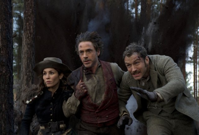 Madam Simza Heron (Noomi Repace), Sherlock Holmes (Robert Downey Jr.) and Dr. John Watson (Jude Law) in Sherlock Holmes: A Game of Shadows.