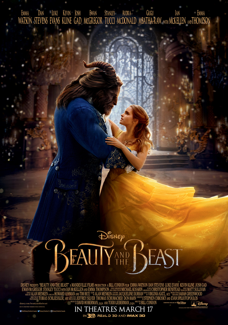 Beauty and the Beast is the live-action Disney remake of their 1991 animated musical classic, directed by Bill Condon with Emma Watson and Dan Stevens in the title roles. At 129 minutes, it is half again as long as the earlier version, allowing for more back story, character development and music.
