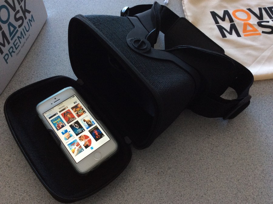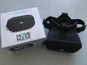 When I was searching for a solution to these problems, after testing out a cheap cardboard VR viewer, I came across the MovieMask, which was made by a team of young inventors in Norway, and successfully funded through a couple of crowdfunding campaigns. As the story goes, they were inspired to make it after seeing The Hateful Eight in theatres, and wanted to find a way to replicate the experience of watching something on the big screen in a darkened theatre. “Your personal cinema experience on the go,” is how they sold it.