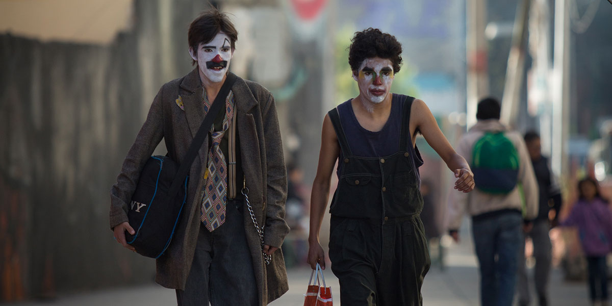 The second film directed by celebrated Mexican actor Gael García Bernal, following his 2007 directorial debut Déficit, Chicuarotes follows teenaged friends Cagalera (Benny Emmanuel) and Moloteco (Gabriel Carbajal), who live in the impoverished neighbourhood of San Gregorio Atlapulco in Mexico City. The film opens with them on a bus, their faces painted like clowns, performing a comedy routine in hopes of making some cash.