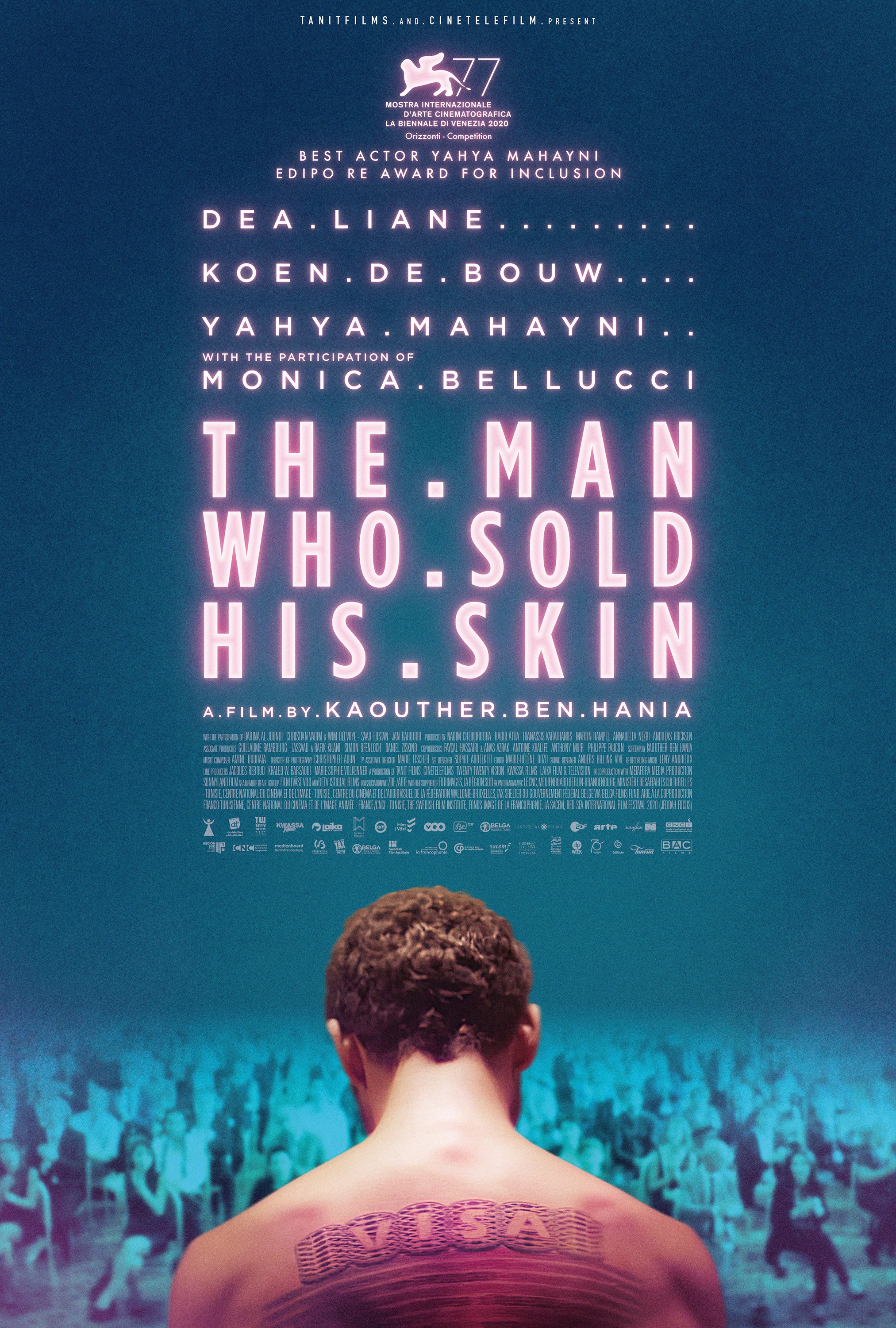 Things change when Sam gets a strange proposition from Jeffrey Godefroi (Koen De Bouw), a pretentious artist who is known for turning “worthless objects” into art. Jeffrey offers to secure him a visa and enough money to get to Europe, in exchange for letting him use his back as a canvass. Sam reluctantly agrees, and Jeffrey tattoos a Schengen visa on his back, turning himself into a living piece of art that ends up being worth a fortune. As he is forced to sit in galleries with his shirt off, and be placed on auction, Sam captures the attention of human rights activists.