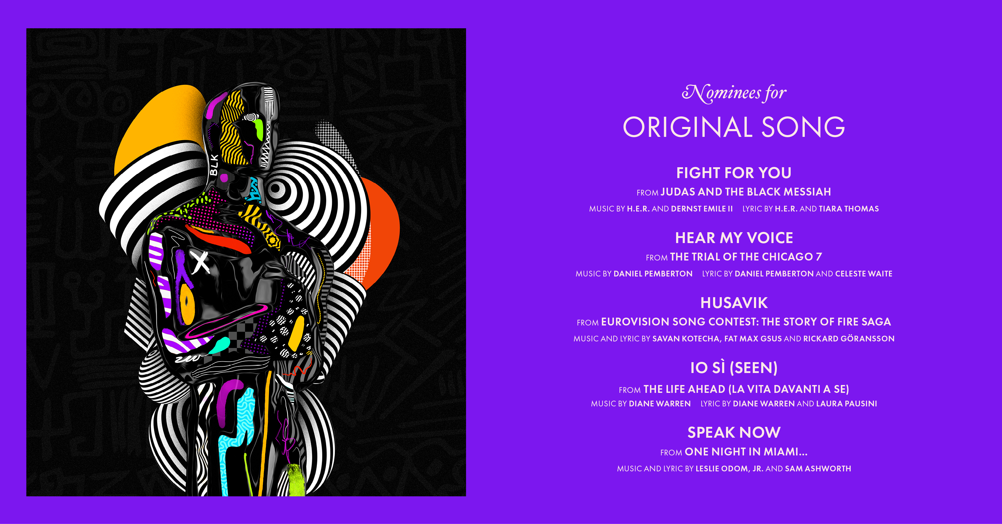 Predicted Winner: “Io Sì (Seen)” – The Life Ahead. Again, this is another race could go any which way. Leslie Odom Jr. could win for his end credits song from One Night in Miami, but I’m thinking that songwriter Diane Warren will finally win on her record twelfth nomination for her tune from the Italian drama The Life Ahead. But, in a sea of end credits songs, the rightful winner would be the soaring “Husavik (My Hometown),” the only one of the nominees that is actually key to its respective film’s narrative.