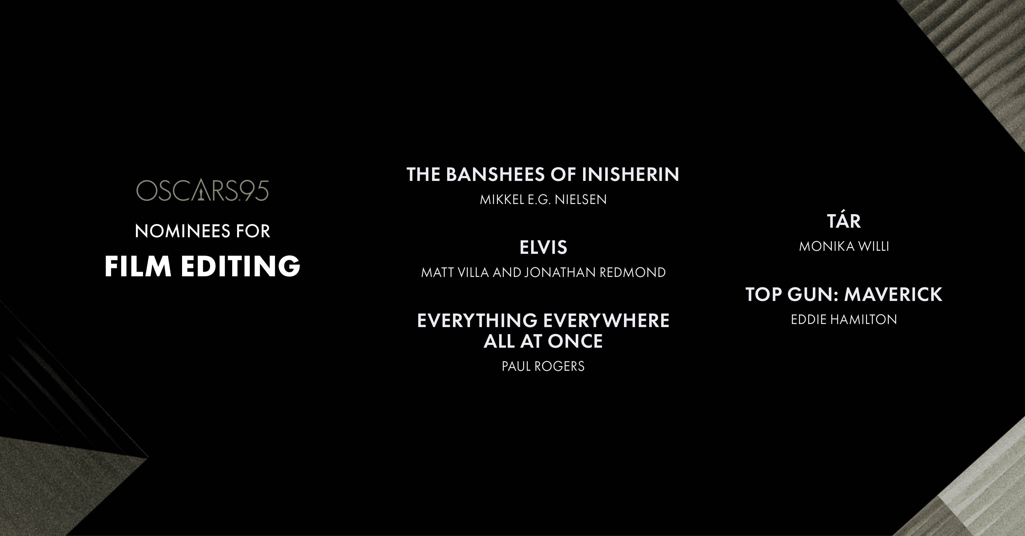 A lot of people have switched to the multiverse-jumping EEAAO in this category, though I’m defiantly sticking to Top Gun: Maverick (which I’m also predicting for sound, and these two categories usually go hand-in-hand). Ford v. Ferrari also won this category in the year of Parasite, so there is precedent for them picking something like Top Gun over the Best Picture frontrunner.