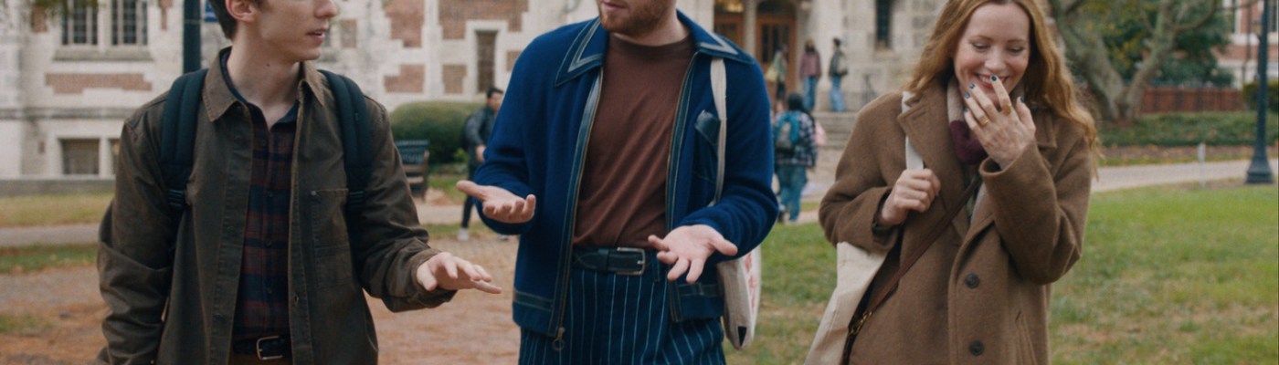 In her spare time, and desperate for something to do, Liz decides to audit a poetry class at the university. It’s here that she meets Ari (Cooper Hoffman) and Sam (Andrew Barth Feldman), two best friends and college seniors who welcome her into their study group. While Ari is a hyperactive dreamer already seemingly adrift in life, and Sam is a nervous, strait-laced kid circling a career in finance, the two are inseparable.