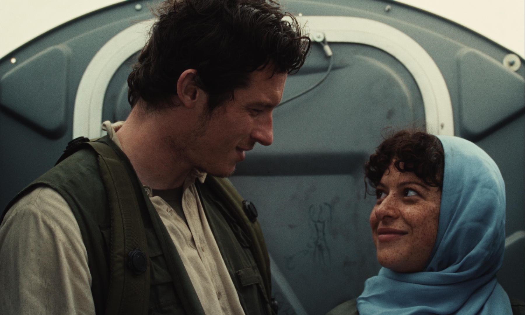 During these exercises, Fayruz meets Abu Dice (Callum Turner), a soldier who is cast as an insurgent. Despite their predetermined roles, the two bond and start spending time together that goes beyond their acting assignments in Atropia.